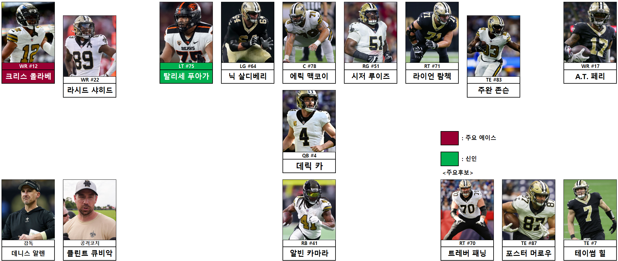 가장 문제가 되는 진형은 바로 오라인이다. 우선 오라인에서 닉 살디베리는 전혀 검증이 되지 않은 선수이다. 23년도 4라운드에 드래프트 되어서 단 18번의 플레이밖에 해보지 않은 선수이고, 시저 루이즈 역시나 20년도 1라운드 픽이긴 하지만, 그에 맞는 퍼포먼스를 지난 4년간 보이지는 못했고 주전정도의 활약만 보였다. 에릭 맥코이는 준수한 모습을 보이는 센터이지만, 가장 중요한 포지션인 레프트 태클을 맡을 것으로 예상되는 탈리세 푸아가 역시 루키이다. 대학리그에서 좋은 모습을 보였고, 기대주인 것은 분명하지만, 신인이 가장 고생을 많이 하는 포지션이 레프트 태클이라는 걸 생각하면 좋은 활약을 보이는게 쉽지 않을 것이다. 허나, 어쩌면 가장 중요한 점은 바로 라이언 램책의 여부이다. 라이언 램책이 필드에 올라설 때는 리그에서 탑급에 분명 분류되는 선수로 오라인의 구멍을 틀어막을 수 있는 선수이지만, 램책은 지난 3년간 풀로 뛴적이 없는 선수이다. 그가 빠지고 그의 후임으로 좋은 모습을 보이지 못한 트레버 패닝이 올라서게 되면 세인츠의 오라인은 최하위권으로 떨어질것으로 보인다.