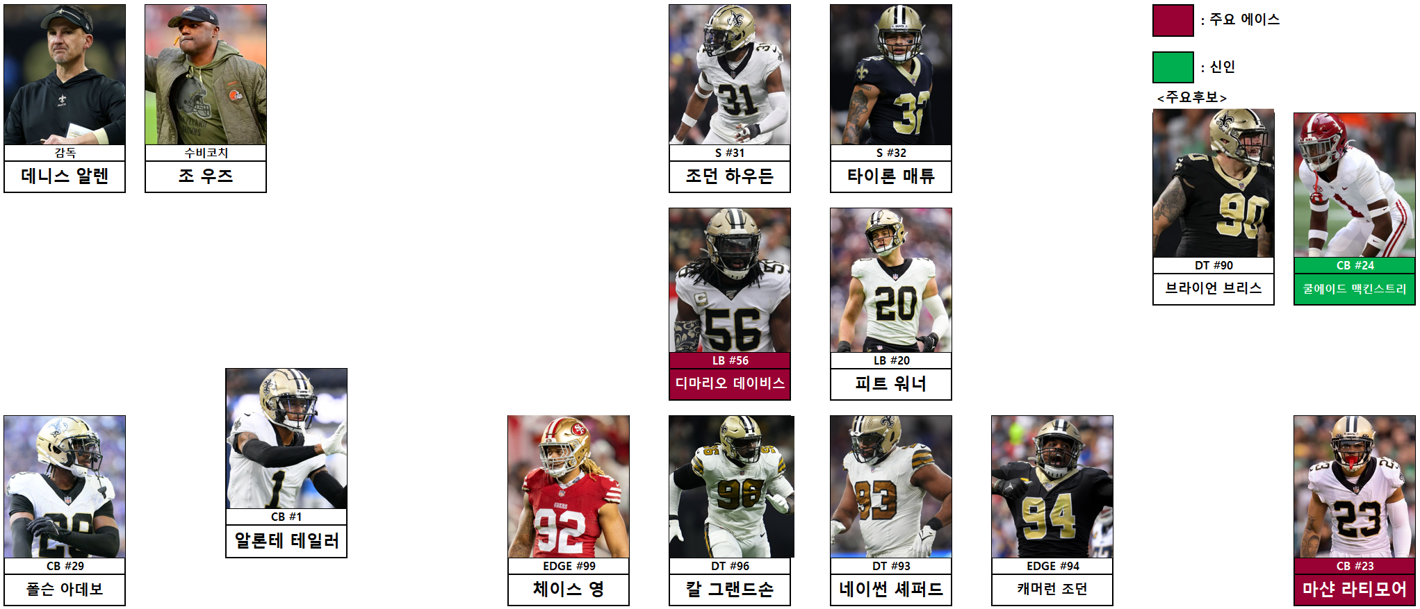 - 세인츠의 수비직은 강력했다. 그런데 그 주역들은 점점 나이가 들어가고 있고, 대체자원이 확실한 상황이 아니다. 특히 세인츠에는 상대방 쿼터백을 압박해줄 엣지러셔가 없다. 쿼터백을 압박없이 2선 수비들만으로 패스를 수비하기는 매우 매우 어렵다. 데니스 알렌 감독의 절묘한 운용이 필요하다.